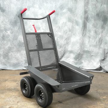 Our muscle carts use 1/8" perforated steel for the floor and back- to help sand bags and other cargo drain out if caught in a storm. Bed is 19.5" wide and 23" deep. 10" pneumatic tires all around keep this cart rolling. EZ to use lever style handbrake holds the load. 29" wide at the fenders.