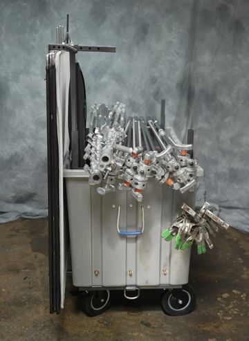 The concept of this cart was maximum density for tight truck packs. The center divider holds 8 Matthews Hollywood combi stands. Other stands can fill the gap with the outer divider. The backside has 2 stand holders and a hand brake. Perforated steel floor for those rainy days.