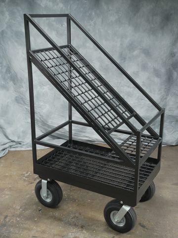 This one is vertically oriented to favor a small footprint. Six crates with a solid shelf on top to carry 2 more crates. 8" no flat casters enable easy rolling on location, swivel casters are total locking. 10" pneumatic or foam filled tires with friction brake are an option, as is a hand brake. Milk crates pictured are not included.