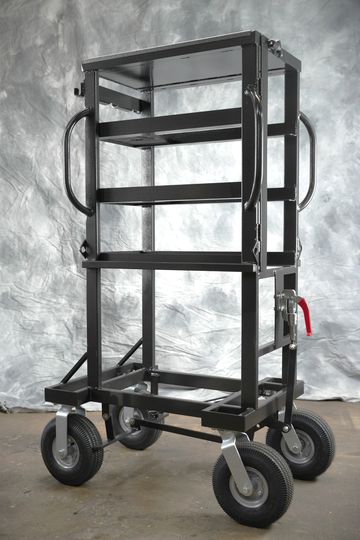 22" wide, designed to squeeze into a tighter truck or high roof van pack. Middle section to keep your frames/reflectors organized. Top shelf has a 1" lip to contain stuff. This cart features combi stand holders in back (Matthews Hollywood style by default) a basket that holds two 1/2 milk crates and 10" pneumatic tires.